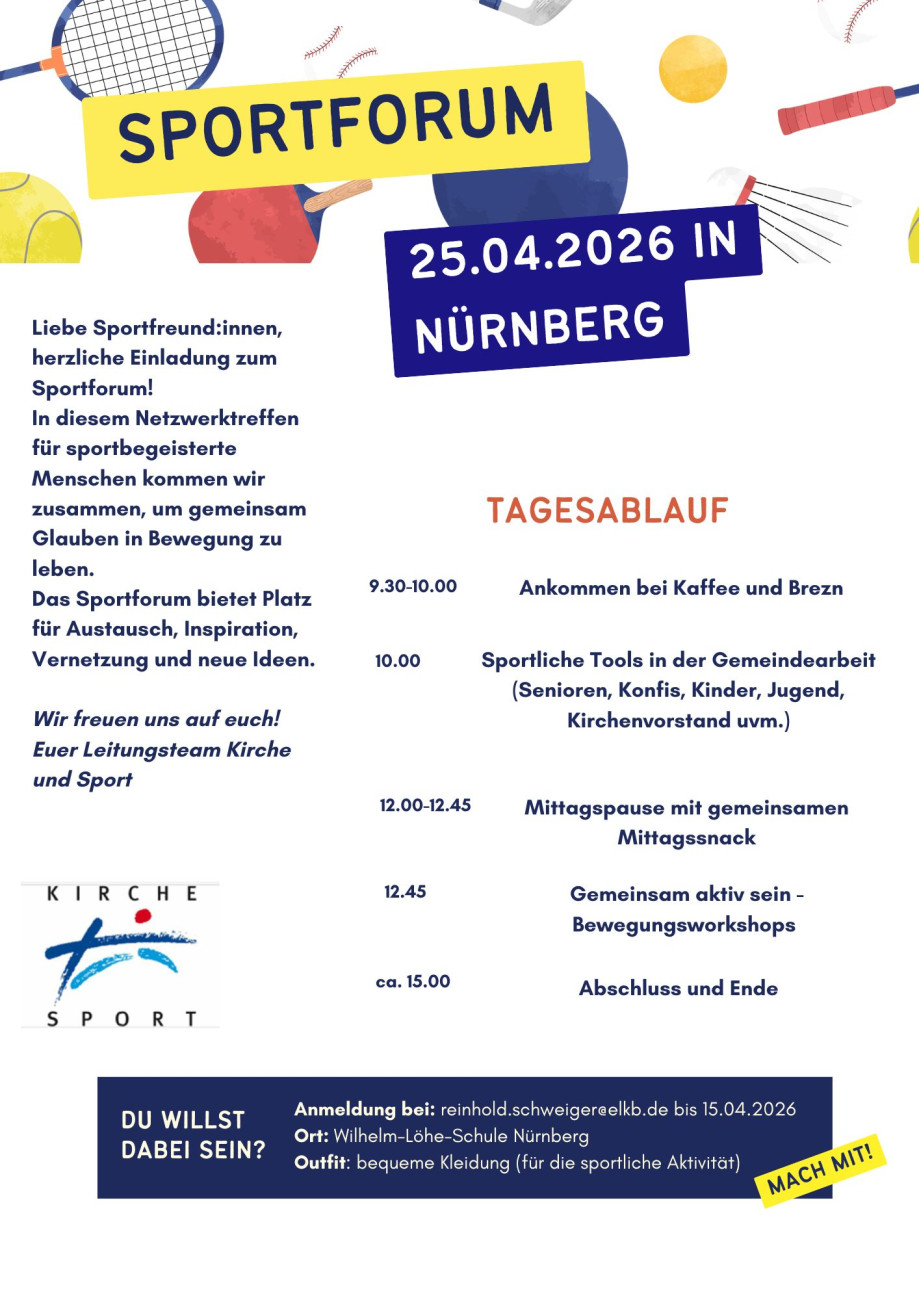 nachdem unser erstes Sportforum im vergangenen Jahr ein voller Erfolg war, laden wir euch herzlich zur Fortsetzung ein! Am 10. Mai 2025 treffen wir uns in der Wilhelm-Löhe-Schule in Nürnberg, um gemeinsam auf die bisherigen Entwicklungen zu blicken, neue Ideen einzubringen und erstmals das Leitungsgremium des Sportforums zu wählen.